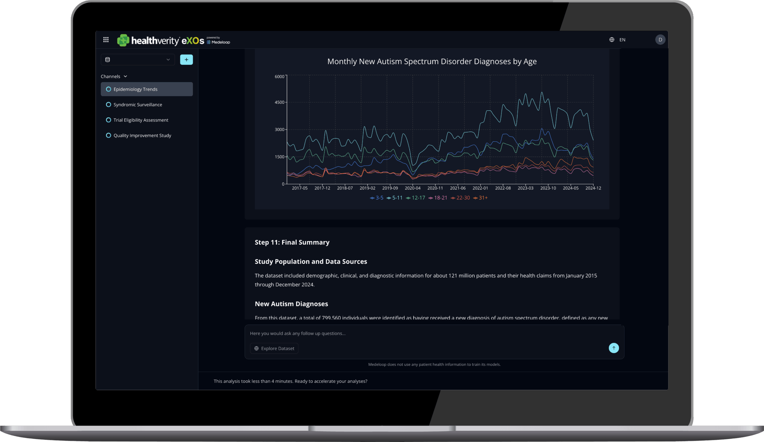 HealthVerity eXOs powered by Medeloop is an AI data analytics tool that enables researchers to write plain-English prompts to rapidly query large datasets to generate real‑world evidence and insights.